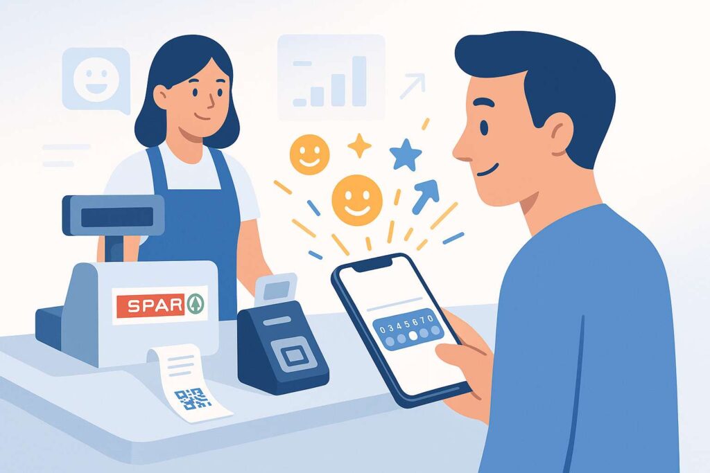 Bei der Kasse jeder SPAR-Filiale ist ein QR-Code angebracht mit dem Hinweis ‘Ihre Meinung ist uns wichtig!’. Scannt der Kunde den Code, so öffnet sich im Browser seines Smartphones ein Chat-Dialog, in dessen Verlauf dem Kunden 3 Fragen zum heutigen Einkaufserlebnis gestellt werden:
